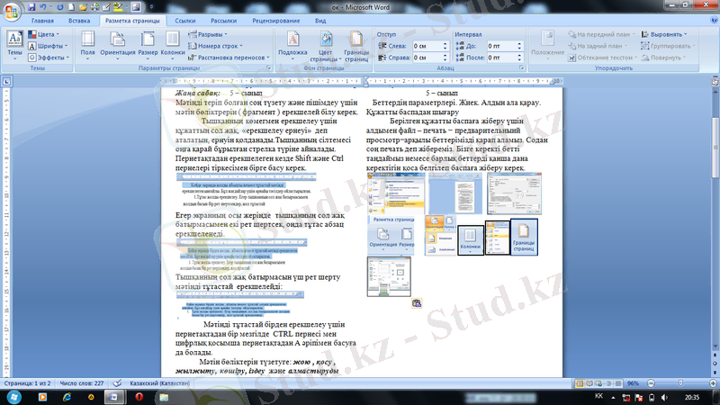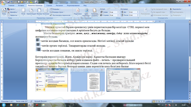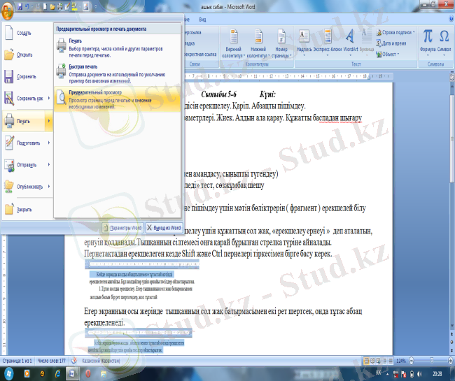 Мақсаты: Оқушыларға мәтіннің үзіндісін ерекшелеу. Қаріп. Абзацты пішімдеу. Беттердің параметрлері. Жиек. Алдын ала қарау. Құжатты баспадан шығару туралы ақпараттар беру. Компьютерде машықтық жұмыстарды өз бетімен жасауға үйрету.