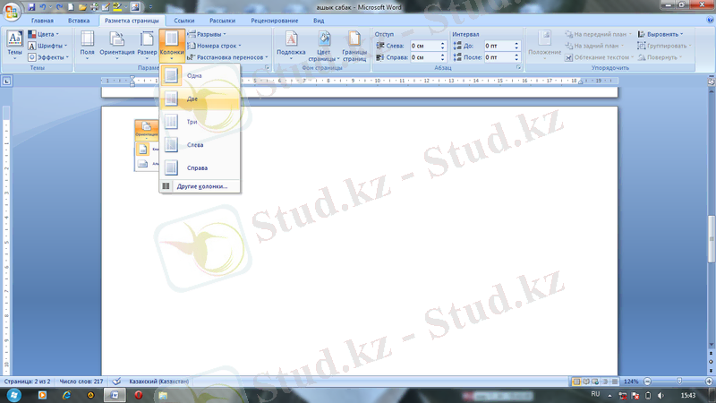 Беттерді бөліктерге бөлу үшін разметка страницы −колонки деп керекті бір, екі, үш немесе оданда көп бөліктерді таңдай аласыз.