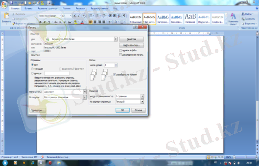Берілген құжатты баспаға жіберу үшін алдымен файл - печать − предварительныий просмотр−арқылы беттерімізді қарап аламыз. Содан соң печать деп жібереміз. Бізге керекті бетті таңдаймыз немесе барлық беттерді қанша дана керектігін қоса белгілеп баспаға жіберу керек.