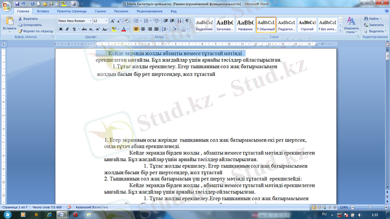 Тышқанның сол жақ батырмасын үш рет шерту мәтінді тұтастай ерекшелейді: