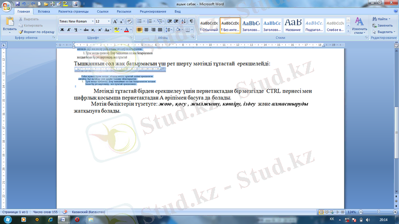 Жаңа сабақ: Мәтінді теріп болған соң түзету және пішімдеу үшін мәтін бөліктрерін (фрагмент) ерекшелей білу керек.