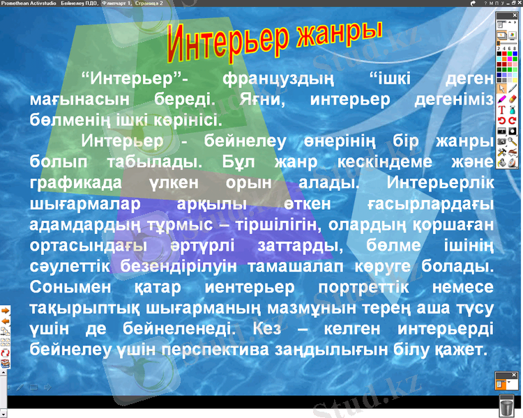 Интерьерді бейнелеу жолдарын үйрету кезінде түрлі әдістерді, интерактивті тақта мүмкіндіктерін қолдану нәтижелі жұмыс жасауға септігін тигізеді. Мұнда алдымен интерьер жанры, оның ерекшеліктері жөнінде мәлімет беріледі. Интерьерді бейнелеу барысында перспектива заңдылықтарының негізгі роль атқаратындығы айтылады.