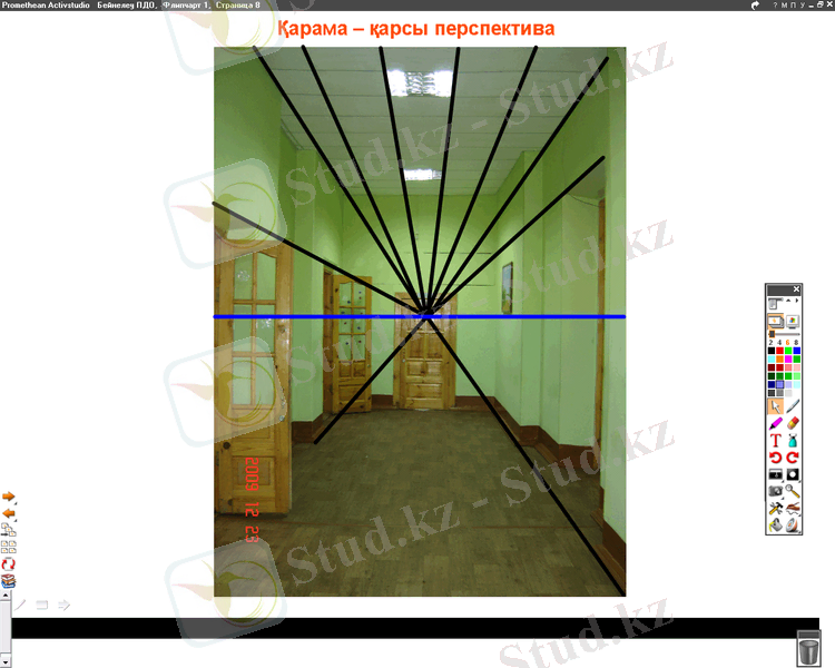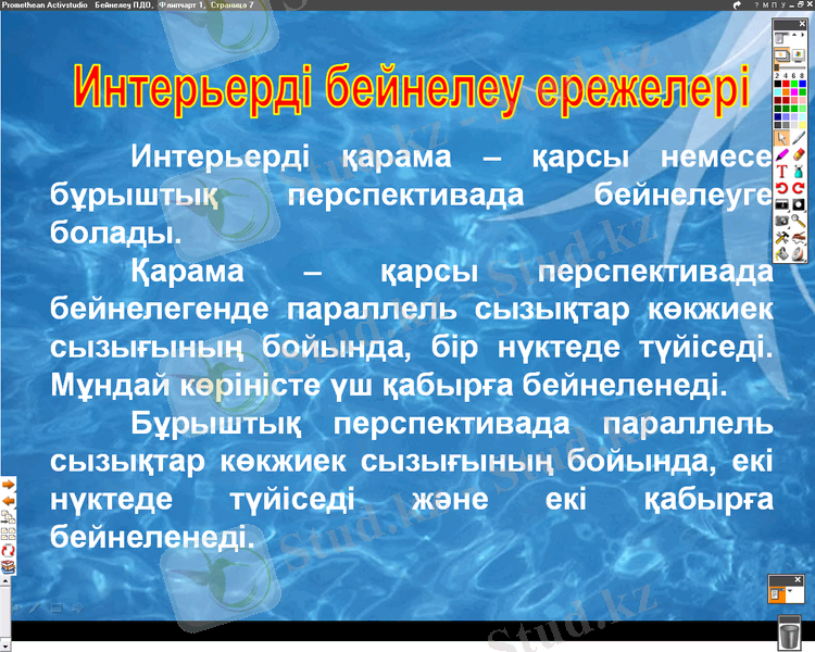 Интерьерді бейнелеу ережелері заңдылықтарға сәйкес түсіндіріледі. Интерьердегі бейнелердің көкжиек сызығына байланысты орындалу жолдары интерактивті тақтаның функциясын пайдалана отырып көрсетіледі. Қарама - қарсы перспективада барлық параллель сызықтардың көкжиек сызығының бойында бір нүктеде түйісуі көрнекі түрде түсіндіріледі. Фотосуреттегі нақты бейнелердің перспективадағы құрылысын көрсету оқушылардың жүйелі түсінуіне ықпалын тигізеді.