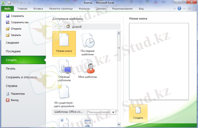 Жұмыс кітабын құру. Жаңа жұмыс кітабын құру үшін Файл менюіндегі Құру командасын таңдау керек. Ашылған диалогтік терезеде солардың негізінде құрылатын жұмыс кітабының қосымшасын, одан кейін шаблонды таңдау керек; соңынан ОК батырмасын шертіңіз.