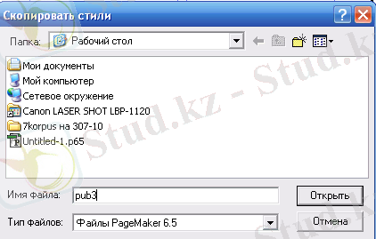 2. Стильді pub3 файлынан импорттайық. Ол үшін «Текст =» Определить стили» командасын орындаңдар. «Определить стили» терезесінде «Импортировать» батырмасын басыңдар. «Скопировать стили» терезесі ашылады (6- сурет), онда қажет : стильдері бар Page Maker файлын таңдау керек. pub3 файлын таңдандар да, «Открыть» батырмасын басыңдар.