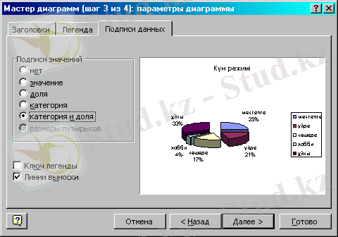 Диаграмма құру барысында Кері (Далее), соңынан Дайын (Готово) батырмасын басу арқылы жасап отырған диаграммамызды аламыз. Диаграммалар мынандай элементтерден тұрады. Тор, тақырып және аңыз.