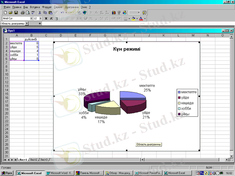 Диаграмма туралы түсінікті болғаннан кейін енді бір күнімізді қалай өткізетіндігіміз жайлы мәліметтер жинақтап, MS Excel-ге енгізейік. Негізгі бес факторға: бірінші - мектеп, екінші - үй, үшінші - көше, төртінші - салауатты өмір (хобби, спорт, мәдени іс-шаралар, үйірмелер, т. б. ) және бесінші - ұйқы, осыларға тоқталуды жөн көріп, шамамен сағатпен алынған уақыт мөлшерін көрсетейік.