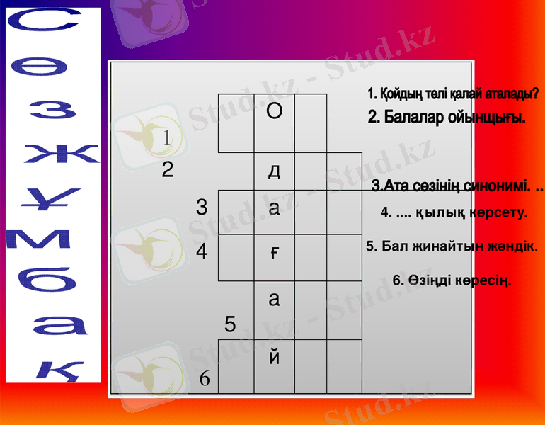 -Балалар, бүгінгі өтетін сабағымыздың тақырыбын табу үшін сөзжұмбақ шешіп көрейік.