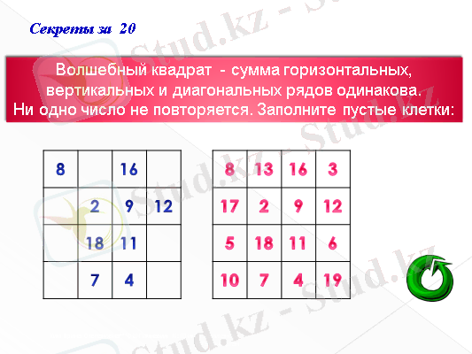 Сиқырлы шаршыдағы сандарды көлденеңінен, тігінен және қиғашынан қосқанда сандардың қосындысы тең болуы керек. Бір сан екі рет қайталанбайды. Бос торкөздерді толтырыңдар.