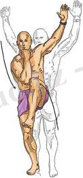 Тік тұрып, бір аяғыңызды алға созып, бүгеміз, екніші аяқты артқа орналастырамыз. Терең тыныс алыңыз, артқы аяғыңыздың өкшесін төменге түсіріңі, алдыңғы аяқтң тізесін бір уақытта бүгіңіз. Дене қозғалмауы тиіс.
