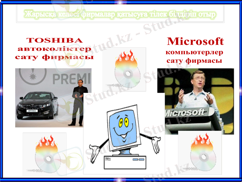 Кәсіби маман- жұмысты, тапсырысты орындайды. Жарысқа келесі фирмалар қатысуға тілек білдіріп отыр. Бұл «Toshiba» автокөліктерсату фирмасы, және «Microsoft» компьютер сату фирмасы.