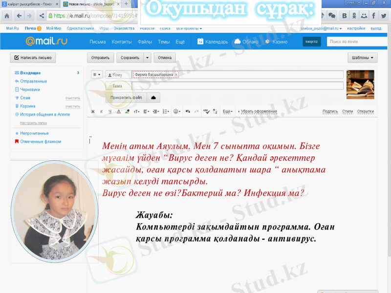 Оқушыдан сұрақ: Менің атым Аяулым. Мен 7 сыныпта оқимын. Бізге мұғалім үйден “Вирус деген не? Қандай әрекеттер жасайды, оған қарсы қолданатын шара “ анықтама жазып келуді тапсырды. Вирус деген не өзі?Бактерий ма? Инфекция ма? Жауабы:Компьютерді зақымдайтын программа. Оған қарсы программа қолданады - антивирус.
