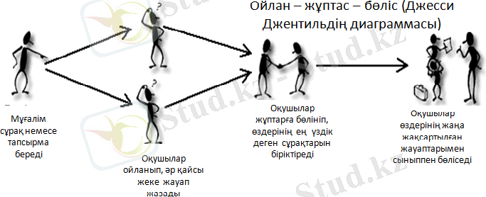 жұптық жəне топтық жұмыс түрлерін жиірек пайдаланады, топта əрқайсысының ролін бақылауда ұстау;