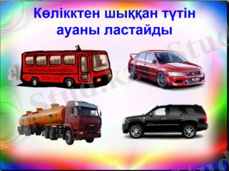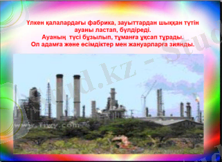 2. Үлкен қалалардағы зауыттардан, фабрикалардан, көліктерден шыққан түтіндер ауаны ластап бүлдіреді.