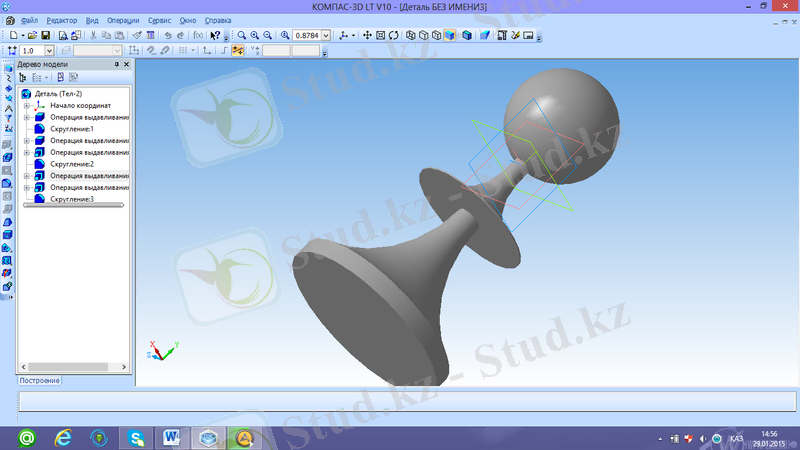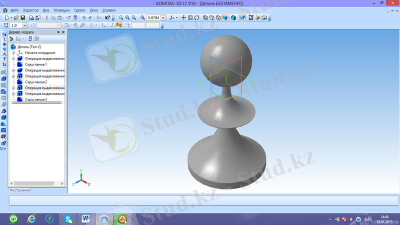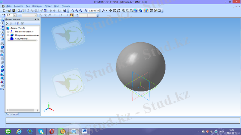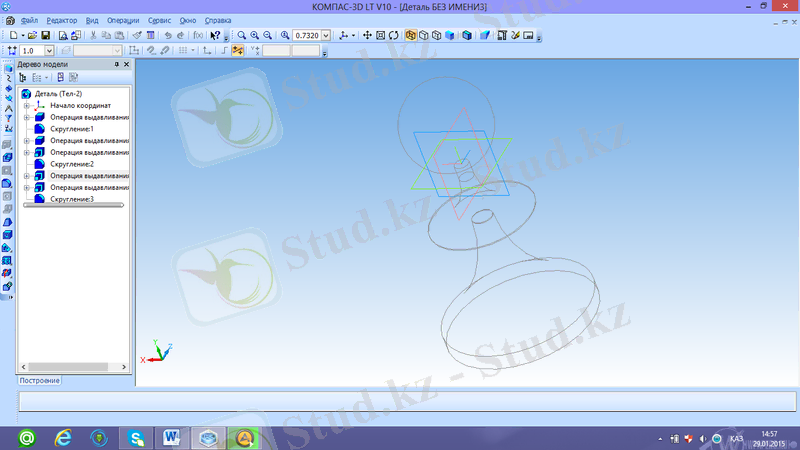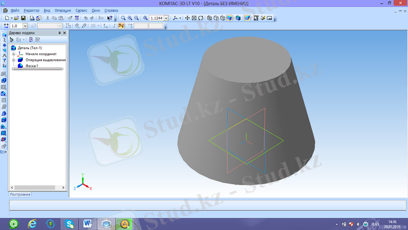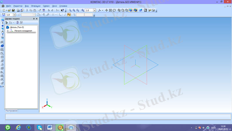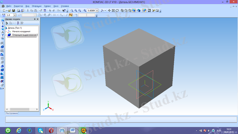Ашылған Деталь [БЕЗ ИМЕНИ] терезесінде геометриялық денелерді 3D форматында (үш жазықтықта) кескіндеуге арналған мәліметтер мен құралды-нұсқаулар толық берілген.