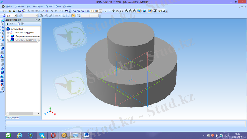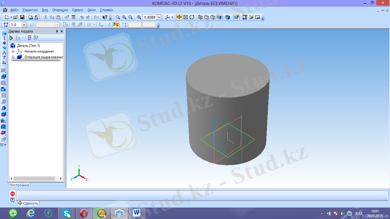 Келесі операция сол жақта жоғарыда Редактирование детали пернесін басқанда төменнен операция выдавливания пернесі ашылады. Осы перне арқылы шеңбердің жазықтығын өзгертеміз. Шеңбер жазықтығы дегеніміз цилиндрдің биіктігі. Операцияны аяқтау үшін тағы төмендегі Auto пернесін басамыз. Терезеден көріп тұрғаныңыздай цилиндрді орентация -дан керекті бағытта ( спереди, сзади, сверху, сзади, слева, справо және изометриялары XYZ, YZX, ZXY немесе диметриясын) қарауға болады. Немесе тышқанның ортасын басу арқылы қозғауға болады.