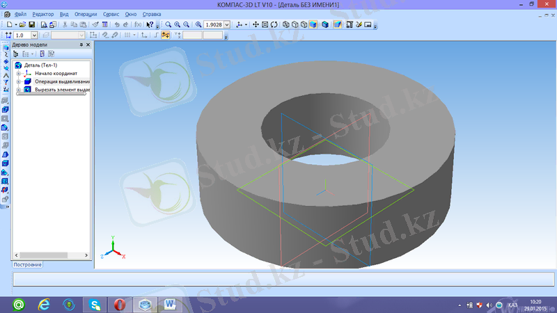 Көріп тұрғандарыңдай сақина да цилиндр кекінен шыққанын байқаймыз. Сақинада қалған денелерге қарағанда үш өлшемді операциямен орындалады. Ішкі, сыртқы диаметрлері және қалыңдығы. Бұнда тұрғызылған цилиндрдің ішіне керекті диаметрде шеңбер сызып, Редактирование детали пернесіндегі отверстие батырмасымен ортасын ойп аламыз.