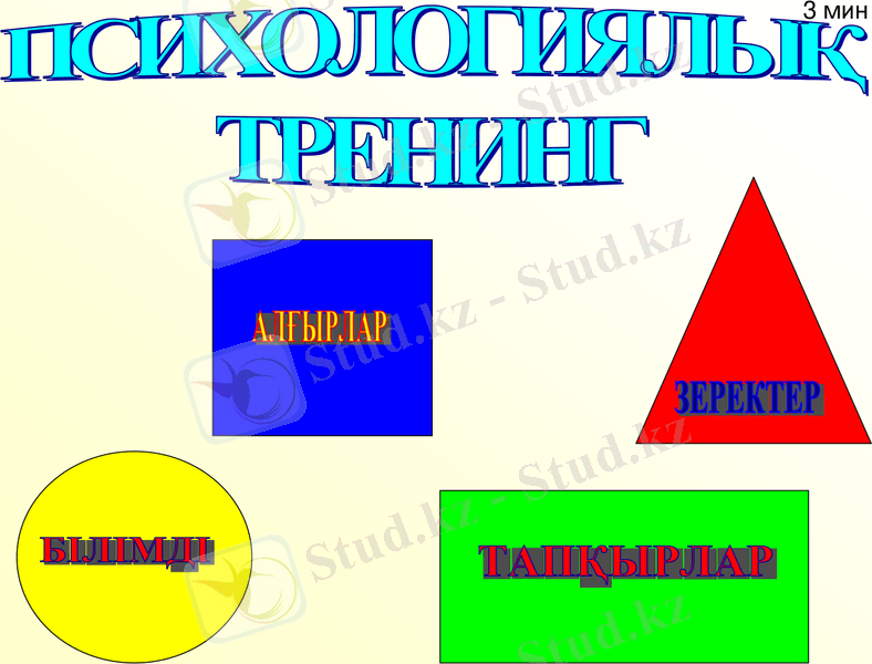- Ал, балалар, мен сендерге қазір психологиялық тренинг өткіземін. Ең алдымен сендер өздеріңе ұнаған фигураларды таңдап алыңдар. Сол фигура арқылы мен сендердің қандай қасиеттерің бар екенін айтамын. Ал қане, таңдап ала қойыңдар!?