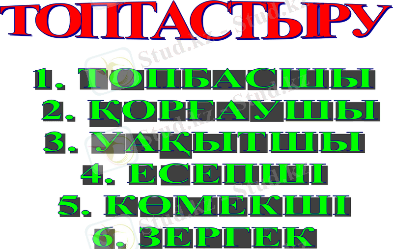 Топтастыру (топбасшы, қорғаушы, уақытшы, есепші, көмекші, дәлелдеуші)