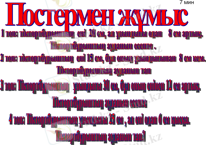 Тік төртбұрыштың ені 8 см, ал ұзындығы одан 4 см ұзын. Тік төртбұрыштың ауданын тап.