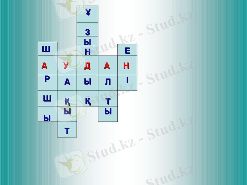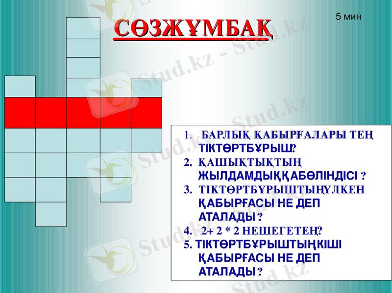 Сабақтың көрнекілігі: слайд-шоу, сөзжұмбақ, постерлер, тапсырмалар, тест