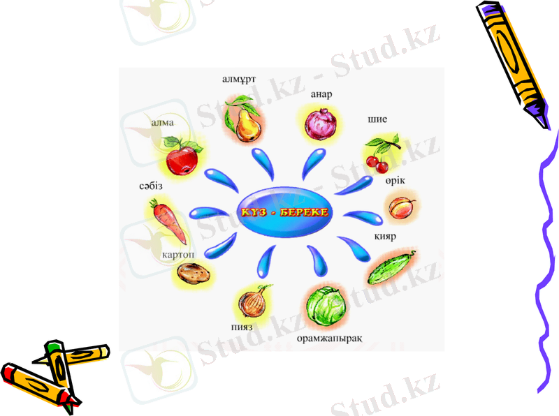 Оқушылардың көздерін байлап, алдарына түрлі жемістер қоямыз (тірі, шын -живые, настоящие) . Қолына бірінші болып ілінген жемісті алады. Содан соң түрлі сын есімнің сұрақтарына жауап береді: