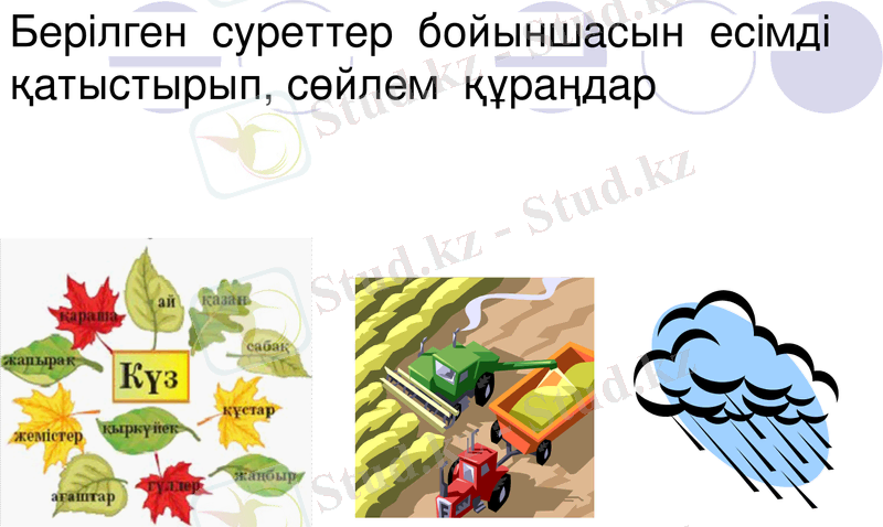 Үлгі: Қазір жылдың берекелі де, мерекелі күз мезгілі. Күзде құстар жылы жаққа ұшып кетеді. Күзде мол астық жиналады. Аспанды қою қара бұлт қаптап, жиі-жиі жаңбыр жауады.