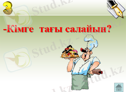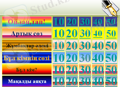 -Тақтаға назар аударыңдар. Ойын бірнеше бөлімнен тұрады. Әр топ ұяшықтарда жасырылған сұрақты таңдап алып кезекпен оларға жауап береді. Дұрыс жауап үшін тиісті ұпай алады. Егер жауап бере алмаса қарсылас топқа кезек беріледі.