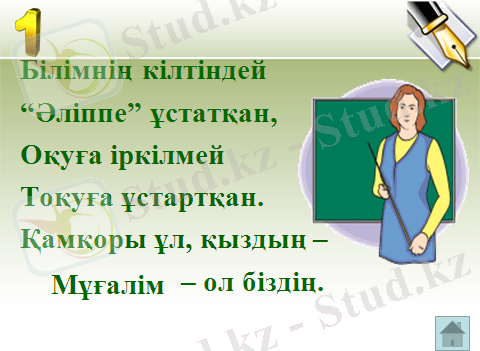 1-оқушы: -Шәкірттерін білім нәрімен сусындатып, жақсы қасиеттерді бойына дарытып, адамгершілік рухта өмірге бағыт-бағдар беруде ұстаздың еңбегі зор.