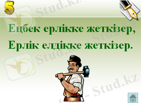 2 - оқушы: Еңбек - адамның қызметі материалдық және рухани жағдайын құруға бағытталған. Еңбек әрқашан мақсатты, яғни әрдайым нәтижелі болу керек.