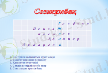 5-слайд. Сөзжұмбақ шешу ( Оқушылар сөзжұмбақтың негізгі сөзі -кілті «Гжель» арқылы жаңа тақырыпты анықтайды)