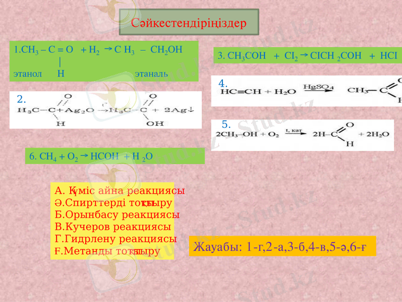 Интербелсенді тақтадан альдегидтер химялық қасиеттері мен алыну теңдеулеріне сәйкестендіру тапсырмасы берілді