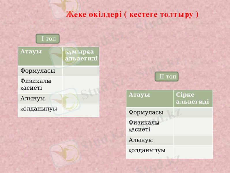 Альдегидтердің жеке өкілдері мен қолданылуын І топқа метаналь, ІІ топқа этаналь бөліп берілді. Төмендегідей кестеге толтырып орындау керек, ол үшін алдын-ала дайындалған арнайы фостер қағаздары мен бояулар таратылды.