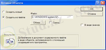 3. Әрбір OLE объектісін пішінге қойғанда шығатын Объектіні кірістіру (Вставка объекта) терезесінде Файлдан жасау (Создать из файла) ауыстырып қосқышын орнатып, Қарап шығу (Обзор) батырмасы арқылы керекті файлдың маршрутын, мысалы, Калькуляторды іске қосу файлының C:\Windows\system32\calc. exe маршрутын орнатқаннан кейін, байланыс жалаушасын орнатып ОК батырмасын басыңдар.