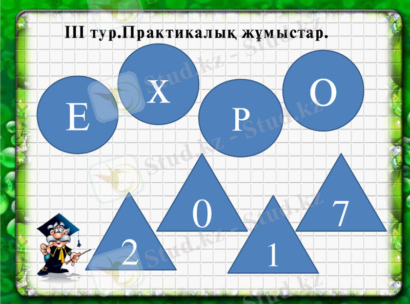 V. Практикалық жұмыстар. Мұнда оқушылар ұяшықтарды таңдап, онда жасырылған есепті шығаруы керек. Әр ұяшықтан есеп пен бірге экспо көрмесі туралы мәлімет аламыз.