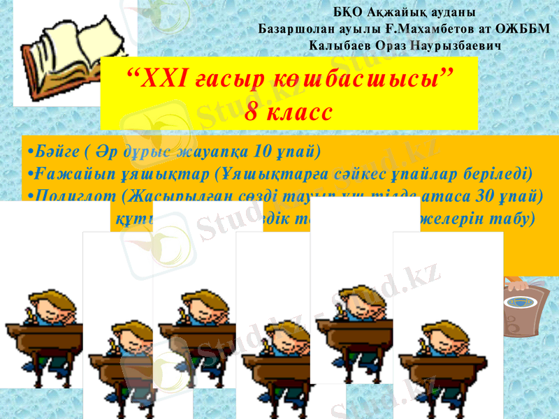 Ғ. Махамбетов атындағы орта жалпы білім беретін мектебінің 8-сынып оқушыларына арналған ХХІ ғасыр көшбасшысы химия зияткерлік ойыны сценарийі (Базаршолан, 2015)