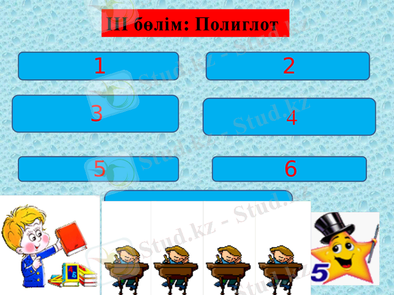 - ІІІ бөлім: Полиглот(жасырылған элементті тауып үш тілде атау, толық жауап 30 ұпай)