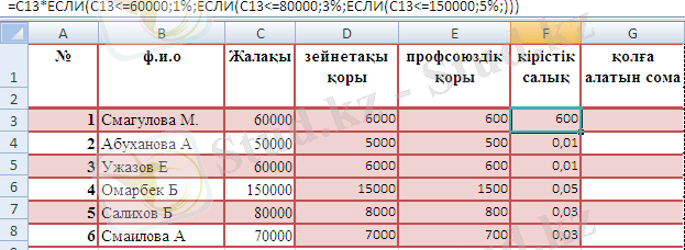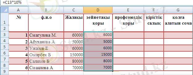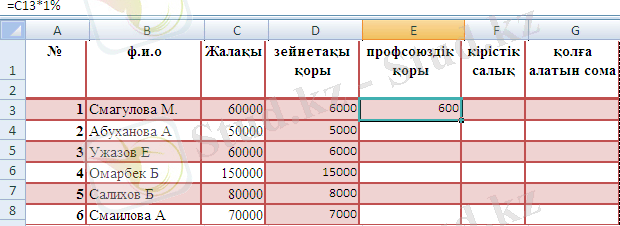 - C1 ұяшығына k енгізуміз ( кестенің үшінші бағанасының аты) ;