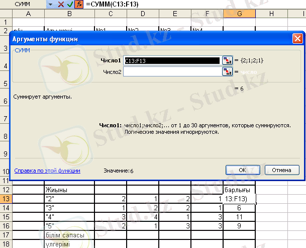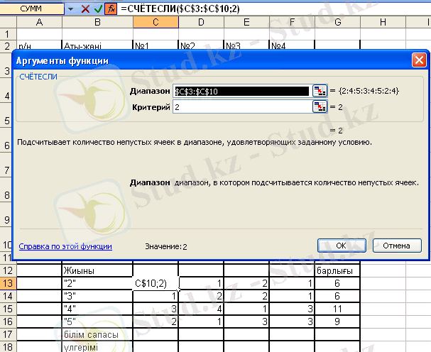 2. Әрбір бақылау жұмысы үшін «2», «3», «4», «5» бағалар санын есептеңдер. Ол үшін «Статические» категориясындағы СЧЕТЕСЛИ функциясын пайдаланыңдар.