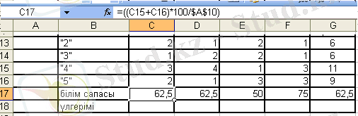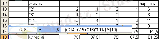 =((C15+C16) *100) /$A$10; «үлгерімі» «3», «4» және «5» баға алған оқушылар проценті болып анықталады, яғни ұяшықтағы формула түрі мынандай болады: