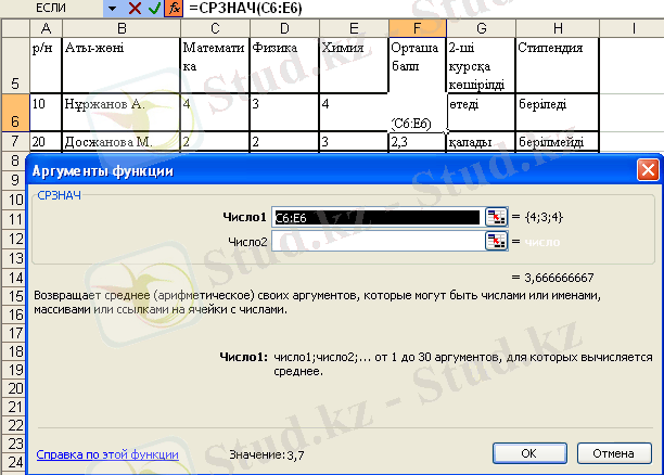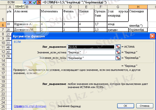4. «Стипендия» бағанасын толтырыңдар. Егер оқушының орташа балы «қойылған балдан» артық болса, онда оған стипендия беріледі.
