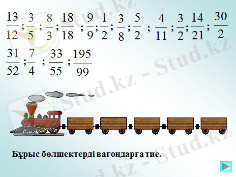Оқушылар есептердің мәні бойынша бірігіп 3 топ құрайды, «Дұрыс бөлшектер», «Бұрыс бөлшектер», «Натурал сандар". сабақ құралдарын тексеріп, орналасады.