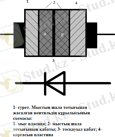 Жауабы: Мыстың шала тотығынан жасалған вентилдің табаны қызыл мыстан тік төртбұрыш немесе диск түрінде жасалған пластина болады. Оның бір жағында мыстың шала тотығының шала өткізгіш қабаты болады. Бұл қабатқа тығыз жабыстырылып қойылған қорғасын пластина контактілік екінші электрод болып табылады.