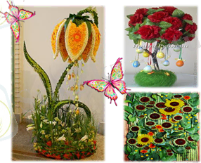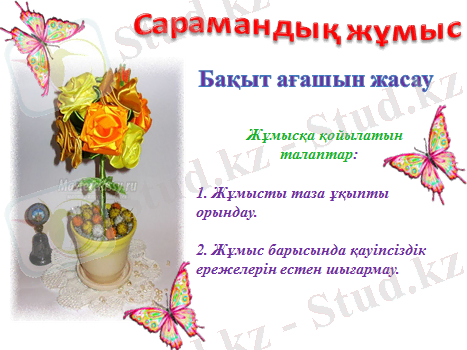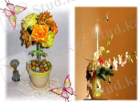 Табиғи материалдан жасалған әр түрлі композициялар үлгілерін көрсетеді (суреттер, ашықхаттар, сабандар, гүлдестелер) .