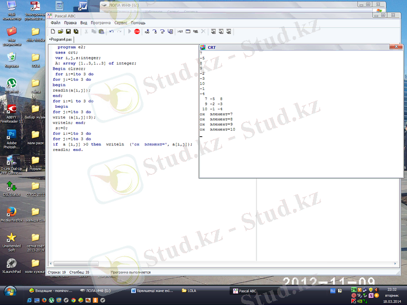 2-есеп. А(3, 3) жиым оң элементтерінің қосындысын табу программасын құр.