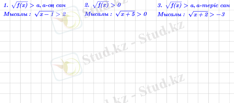 Анықтама. Айнымалысы түбір таңбасының ішінде немесе бөлшек көрсеткішті дәреженің негізі болатын теңсіздікті иррационал теңсіздік деп атайды.