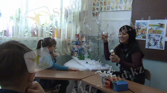 - Балалар, Шұғыла тоңып қалды. Шұғылаға көмектесеміз бе? Ендеше, осы «қыраулы бұтақтардан» бір-бірден алып, қыс мезгілінің ерекшеліктері туралы әңгімелеп, мына күміс құмыраға салуларың керек. (балалар тапсырманы орындайды)