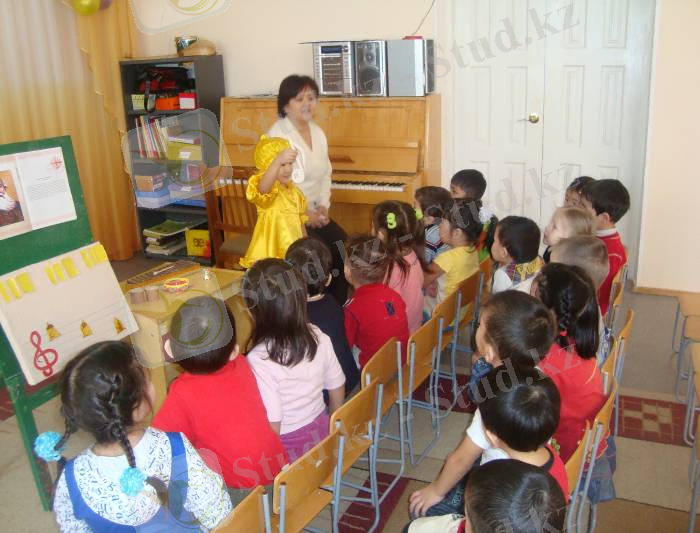 Саз жетекшісі: Сәлеметсіздер ме, балалар! Балалар бүгінгі сабағымыз ерекше. Ерекшелігі бізге көптеген қонақтар келіп отыр, сондықтан біздер келген қонақтарымызға ән-күй сабағымызда не үйрендік соның бәрін көрсетейік. Ой, балалар бізге әнші балапан қонаққа келіп тұр. Қолында сазды сиқырлы қоржыны бар екен. Әнші балапан, сенің қоржыныңда не бар?
