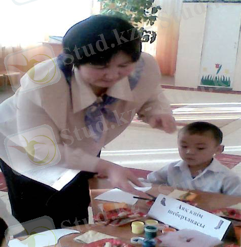 Тәрбиеші жұмыстары орындалған үстелге жақындап, балаларға сұрақ қояды, өнер туралы мақал-мәтелдер айтылады, тақпақтар оқылады.