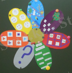 Қажетті көрнекі құралдар: Жеті түсті желекті гүл, алма ағашы, сандар, жеті қабатты үй, геометриялық пішіндер.